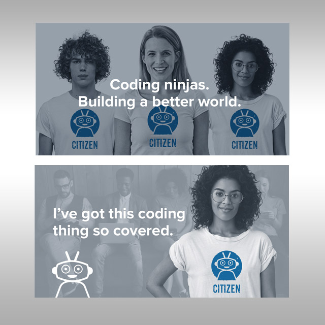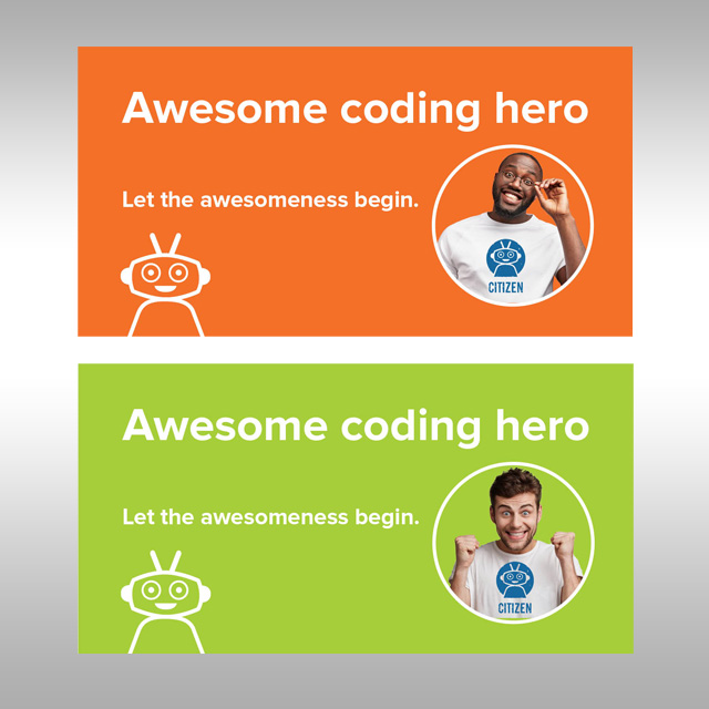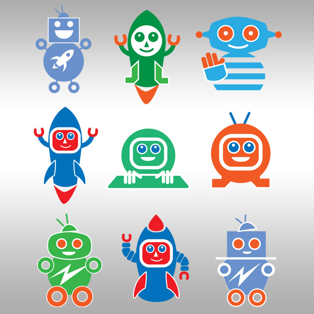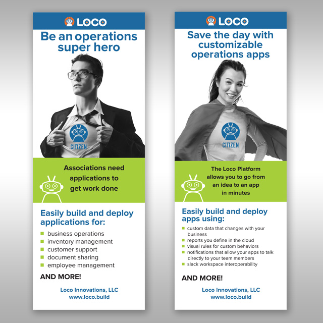 Stephen B. Starr Design explored many iterations of the "friendly robot," settling finally on the orange and blue martian who has become the mascot for Loco. We have depicted him in a variety of positions — standing, in the circle, outside the circle. The mark is proving to be very versatile. Our color palette mirrors the colors for Breakthrough Technologies, but that is as far as the relationship goes.