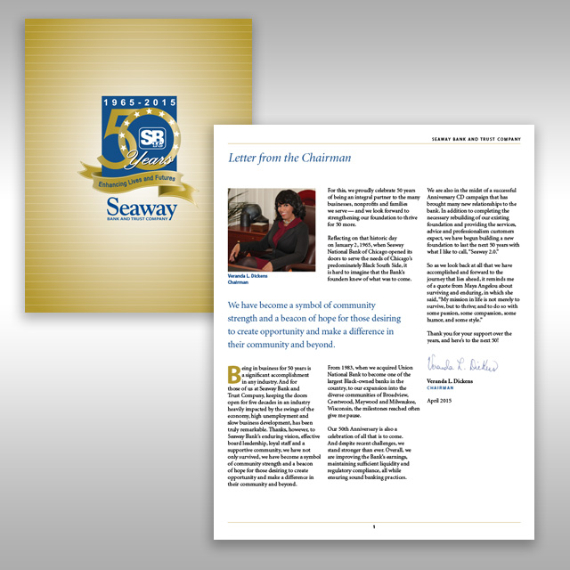 Stephen B. Starr Design first designed the annual report for Seaway Bank in 1995 and became their trusted voice when it came time to present themselves to stockholders. The largest black-owned bank in the U.S., Seaway was an institution on Chicago’s south side. It opened in 1965 during a period when racial discrimination in lending practices was a chronic problem for black-owned businesses and black people seeking real-estate loans.